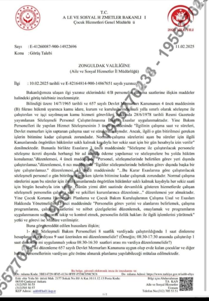 Bakanlığımıza ulaşan ilgi yazınız eklerindeki 4/B personeline çalışma saatlerine ilişkin maddeler halindeki görüş talebiniz incelenmiştir.