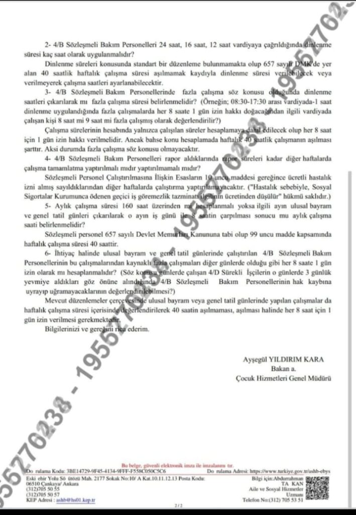 Ancak Aile Bakanlığı idarecileri 4Dli işçileri her türlü iş kanununa muhalif çalıştırmaya alışkın olduğundan, ve yetkili sendikanın da tüm bu hukuksuzluklara üç maymunu oynamasından alışageldiğimiz tarzda 4Dli çalıştırır gibi 4Bli personeli çalıştırma eğiliminde hareket etmekte. Buna yükselen itirazlar neticesinde, fazla çalıştırılan 4B’li personele izin hakkını kullandırmayan veya yanlış hesaplama yapan idarelere cevap niteliğinde bir yazı yayınlandı. Yazının tam metnine aşağıdan ulaşabilirsiniz. Yazı özetle: