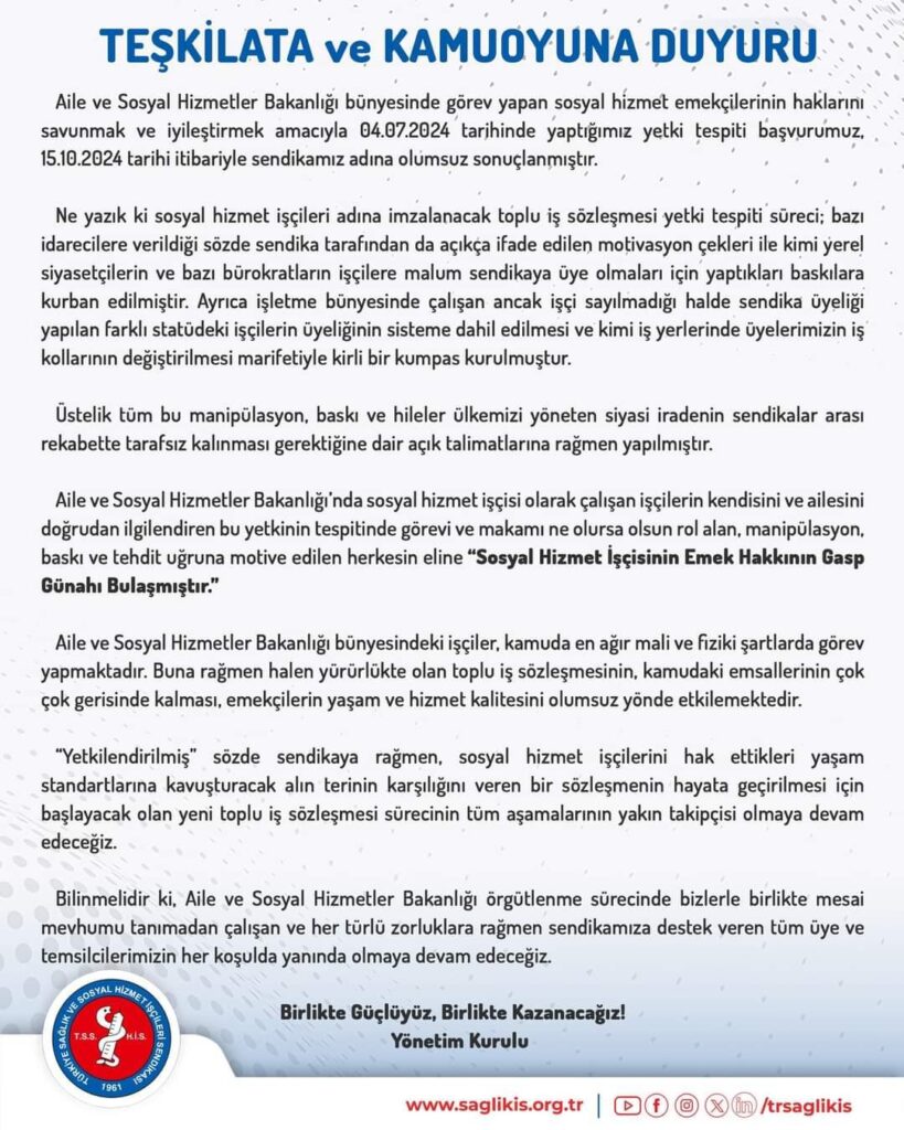 Aile ve Sosyal Hizmetler Bakanlığı bünyesinde görev yapan sosyal hizmet emekçilerinin haklarını savunmak ve iyileştirmek amacıyla 04.07.2024 tarihinde yaptığımız yetki tespiti başvurumuz, 15.10.2024 tarihi itibariyle sendikamız adına olumsuz sonuçlanmıştır.