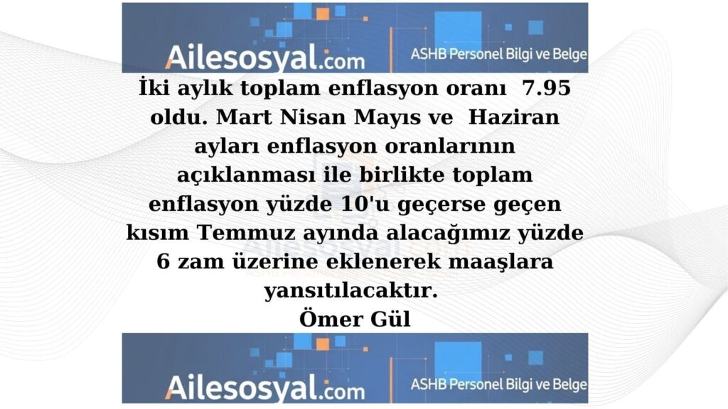 Yılın ilk iki ayına ilişkin toplam enflasyon oranının yüzde 7,95 olarak gerçekleşmesi, Aile ve Sosyal Hizmetler Bakanlığı (ASHB) işçileri açısından Temmuz ayında uygulanacak ücret artışı sürecini doğrudan ilgilendiriyor.