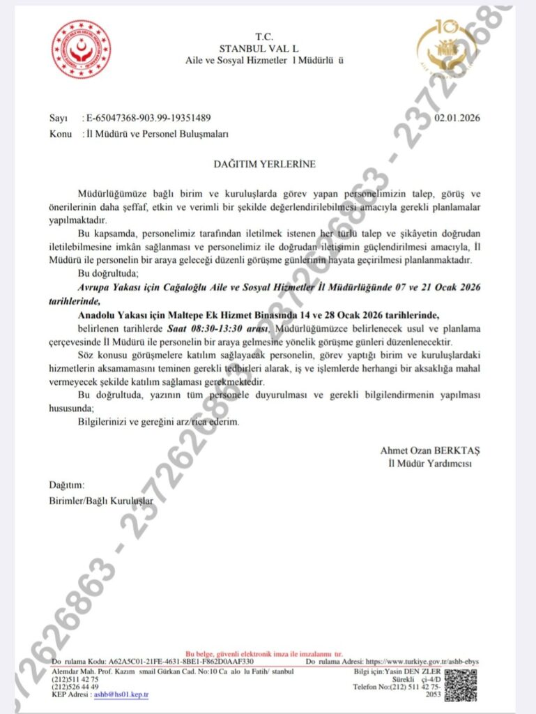 02 Ocak 2026 tarihli ve “İl Müdürü ve Personel Buluşmaları” konulu yazıya göre; il müdürlüğüne bağlı birim ve kuruluşlarda görev yapan personelin, istek ve şikâyetlerini doğrudan iletebilmesine imkân sağlanması ve kurumsal iletişimin güçlendirilmesi hedefleniyor.