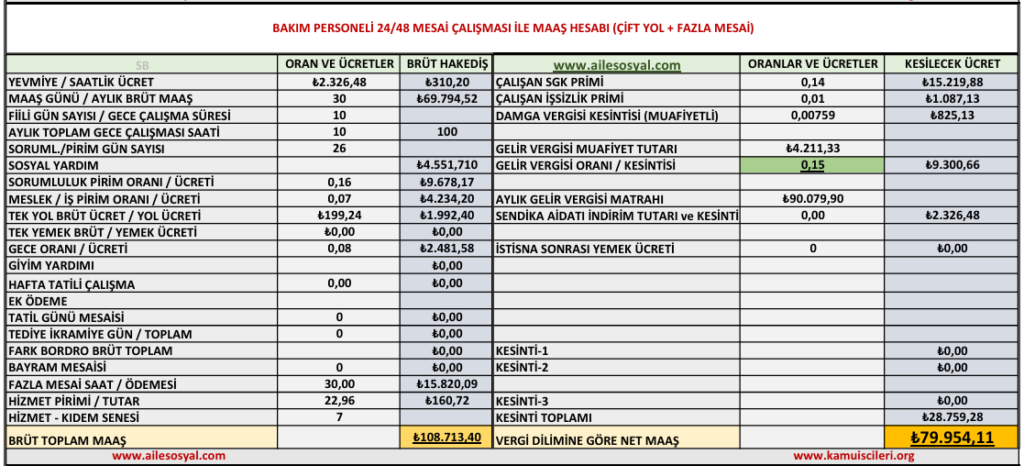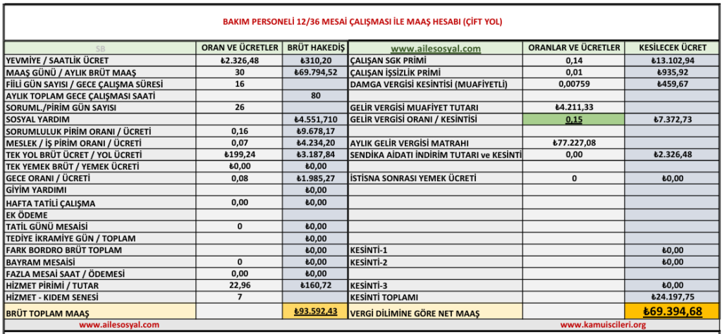 Yeni tabloda özellikle bakım personeli için iki farklı mesai saati üzerinden hesaplama yapıldığı görülüyor. 12/36 mesai sistemiyle çalışan bakım personelinin brüt hakedişi 93.592,43 TL olarak belirlenirken , 24/48 sisteminde fazla mesai dahil brüt tutar 108.713,40 TL seviyesine ulaşıyor.