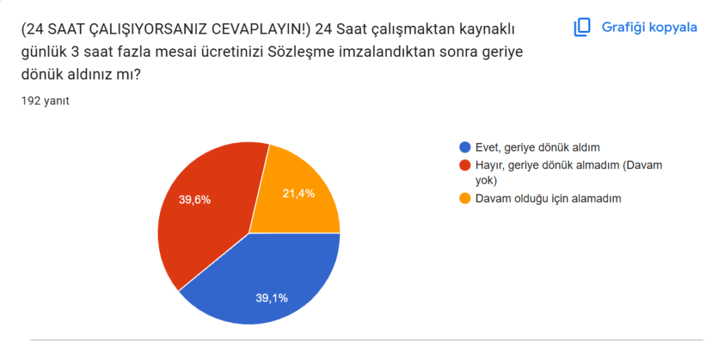 • 24 saat çalışanların %39,1’i  sözleşme imzalandıktan sonra geriye dönük fazla mesai ücretlerini aldığını belirtmiştir.