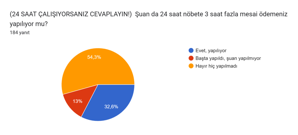 • Yani, 24 saat çalışanların %32,6’sına  hali hazırda 24 saat nöbete karşılık gelen 3 saatlik fazla mesai ödemesi yapılmaya devam etmektedir.