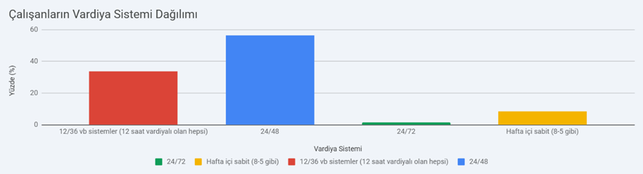 • Analiz: En yaygın sistem 24/48‘dir (%56.5). Bu sistem, 24 saat kesintisiz çalışmayı ve ardından 48 saat dinlenmeyi gerektirmekte olup, personelin dinlenme süresi ve sosyal yaşam dengesi üzerinde ciddi bir baskı oluşturmaktadır.