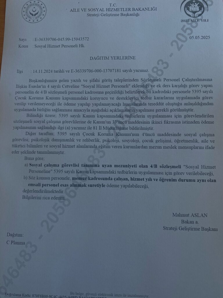 Aile ve Sosyal Hizmetler Bakanlığı, 5 Mayıs 2025 tarihli resmi yazısıyla, kısa süre önce ek ders karşılığında görev yaparken 4/B sözleşmeli statüsüne geçirilen sosyal hizmet personelinin görev ve ödeme durumuna ilişkin önemli bir düzenlemeyi resmiyete kavuşturdu.