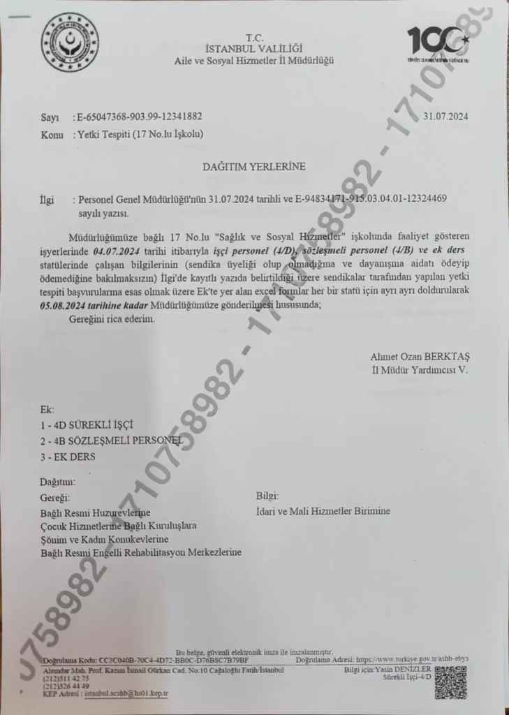 Çalışma Bakanlığı, Aile ve Sosyal Hizmetler İl Müdürlüklerinden, 17 No’lu “Sağlık ve Sosyal Hizmetler” işkolunda faaliyet gösteren işyerlerinde, 04.07.2024 tarihi itibarıyla işçi personel (4/D), sözleşmeli personel (4/B) ve ek ders statülerinde çalışan personelin listelerini istedi.