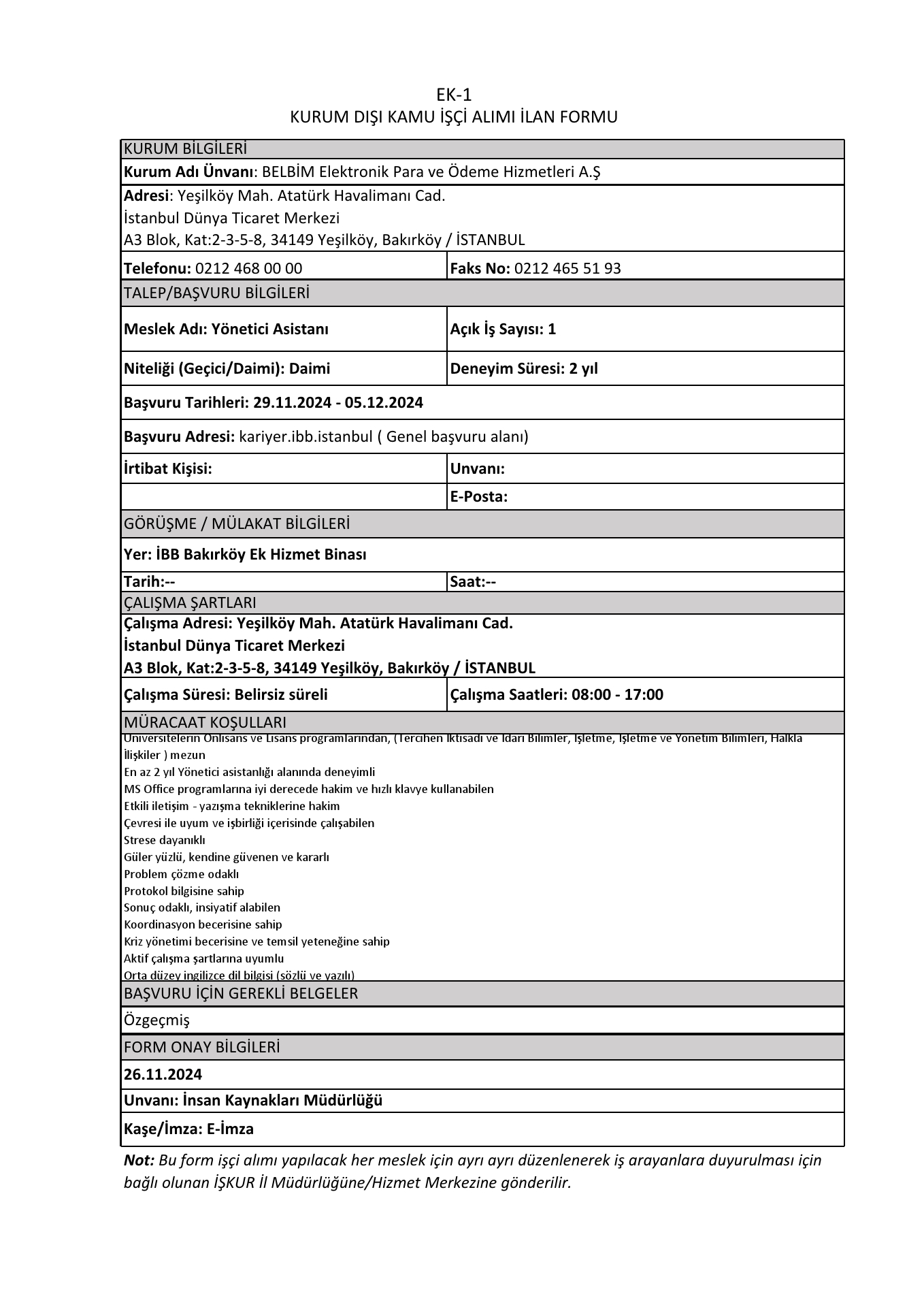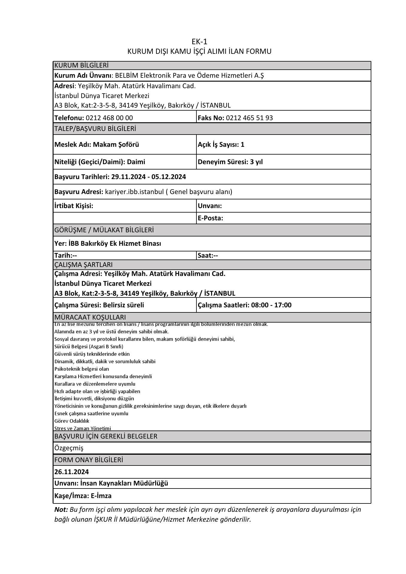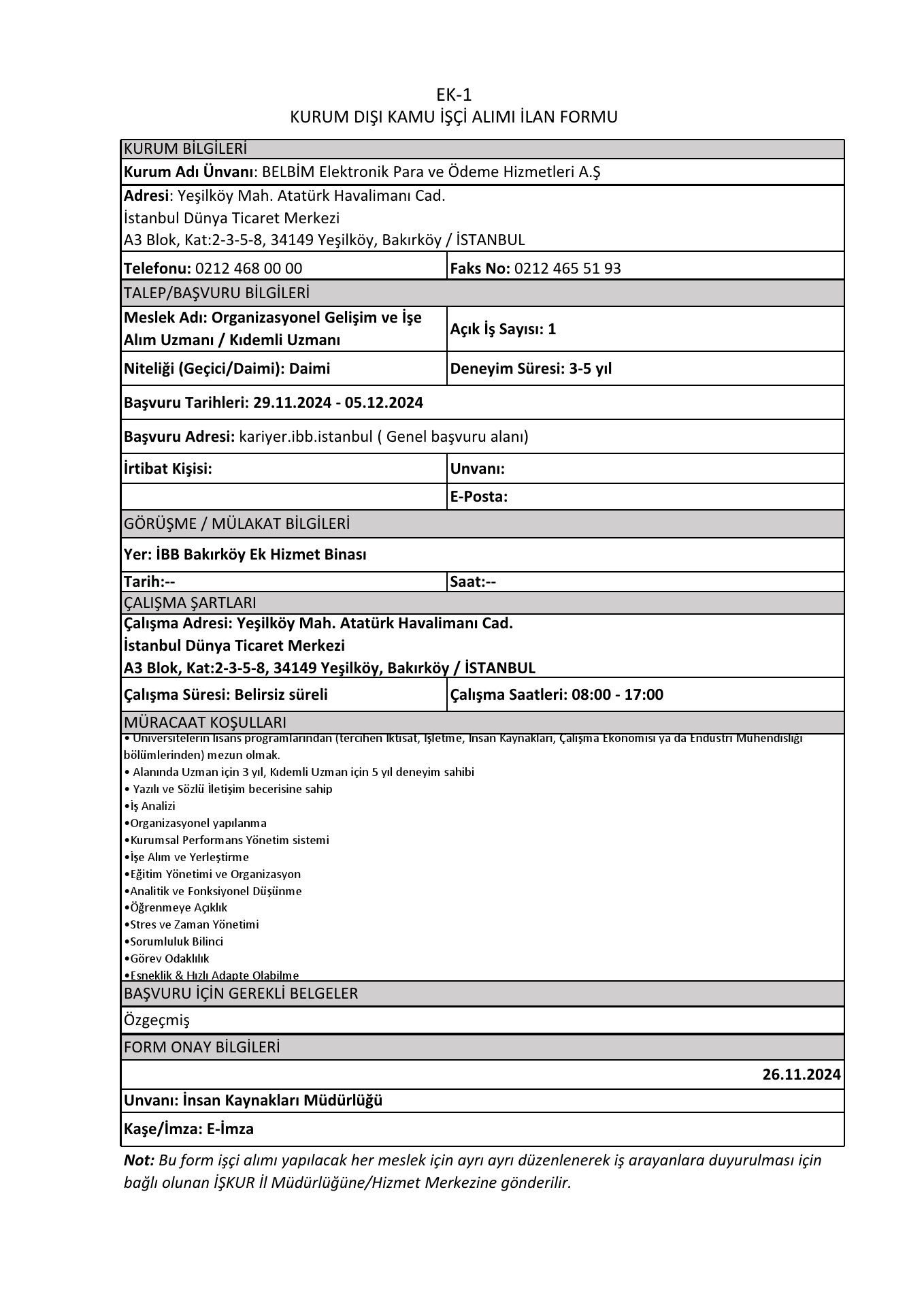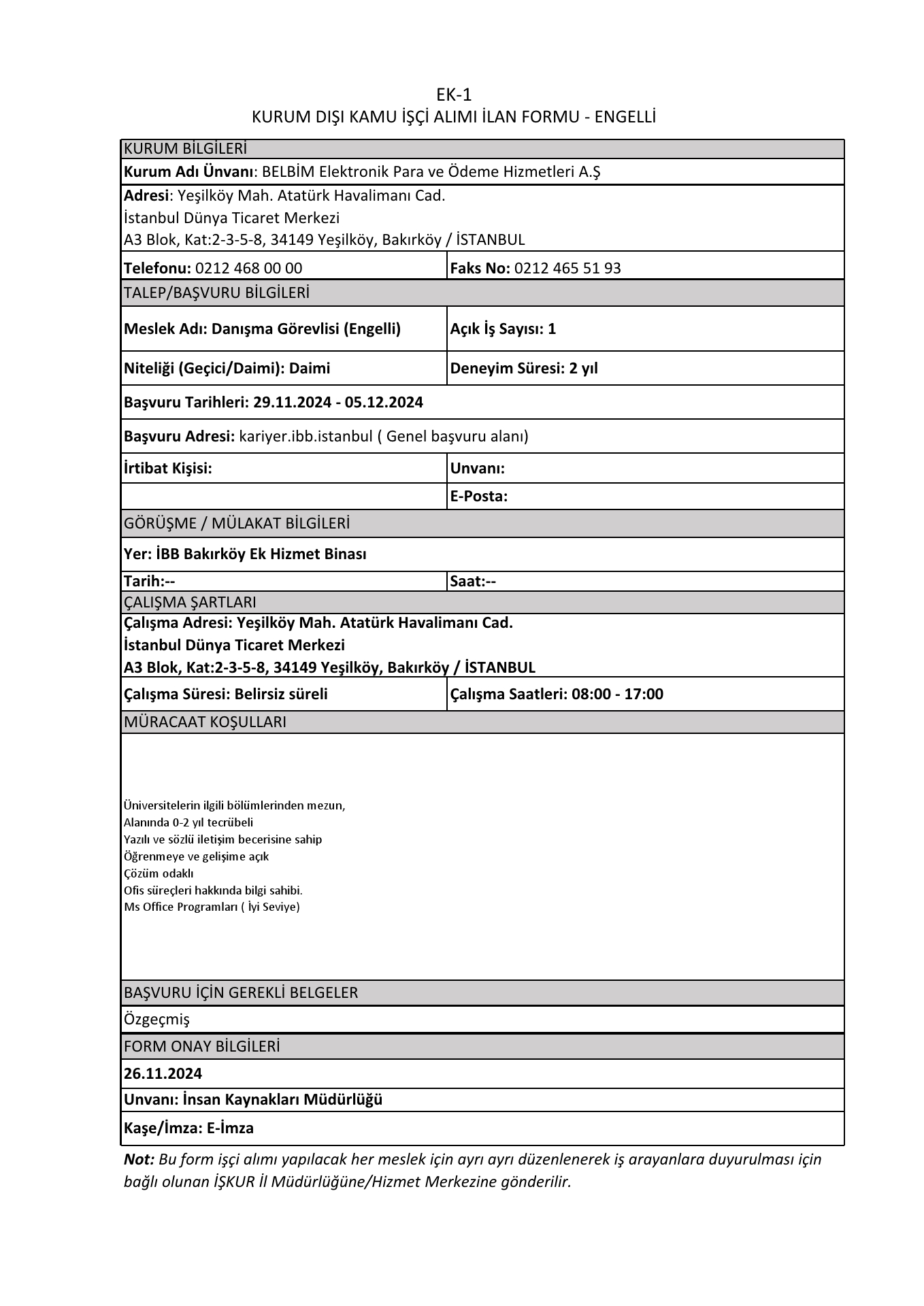 İstanbul Belbim 4 İşçi Alacak. Son başvuru tarihi 5 aralık 2024