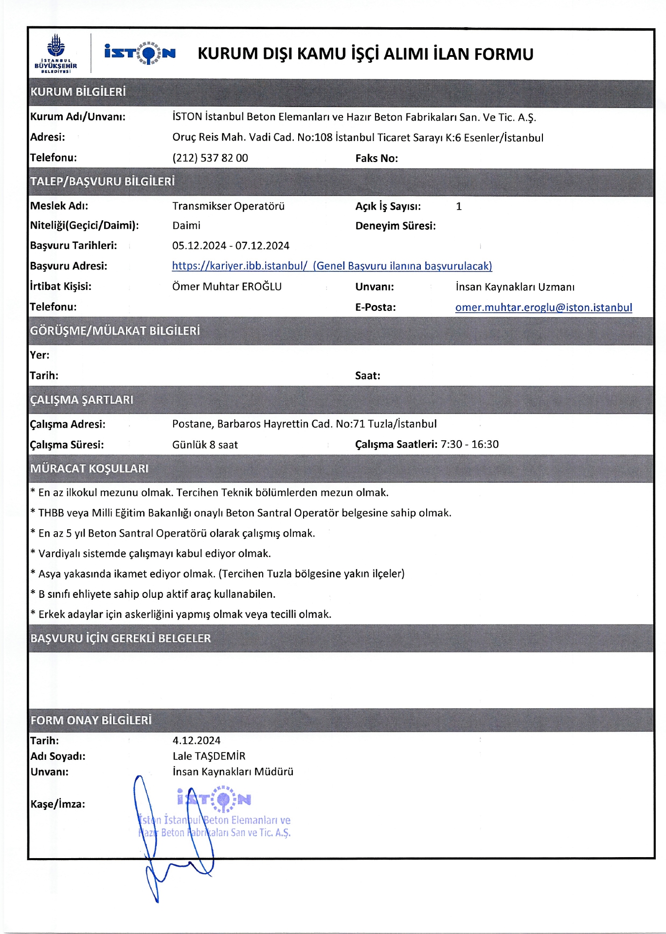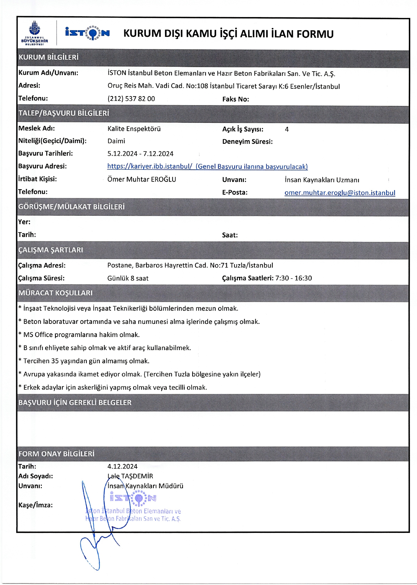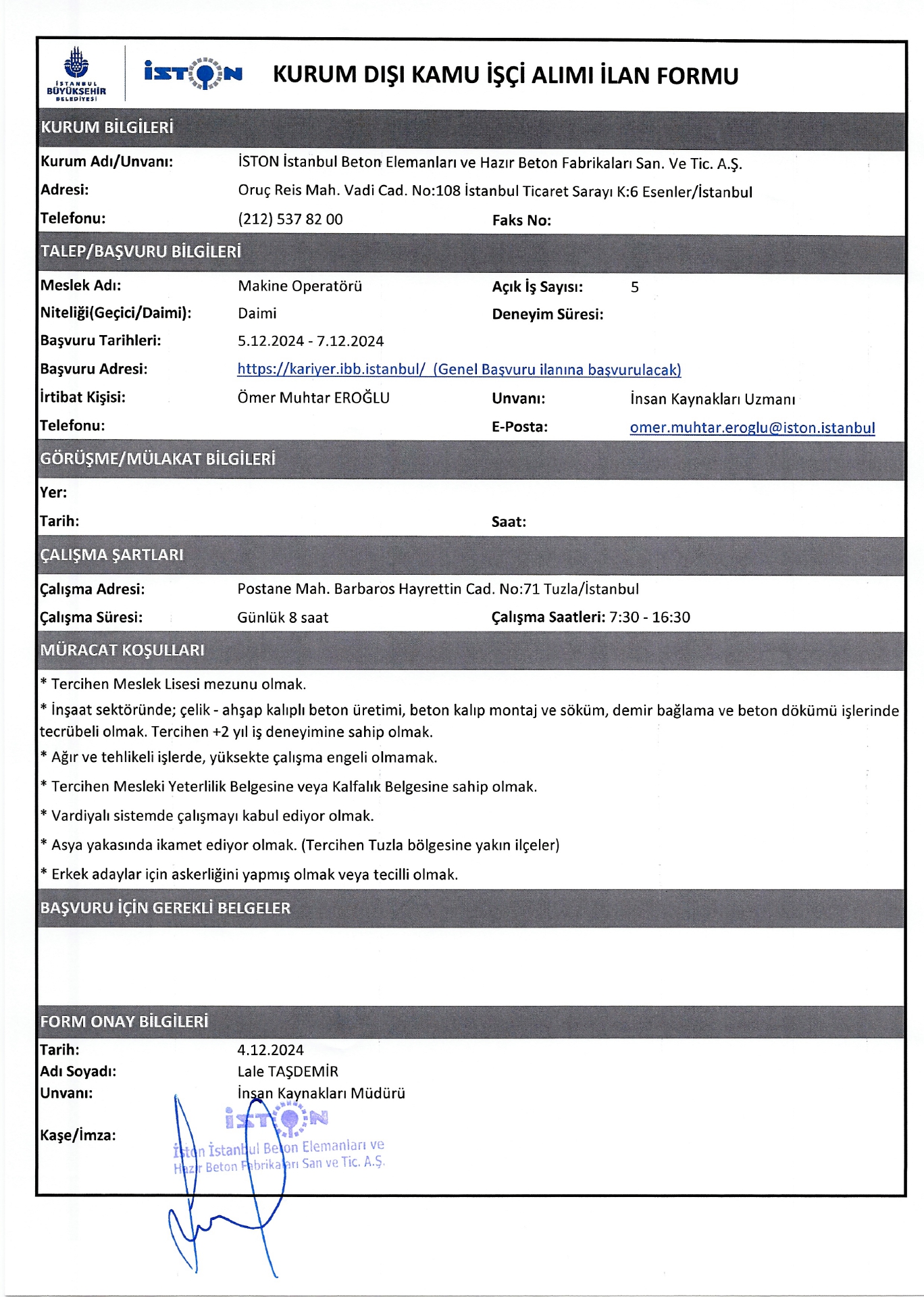 İstanbul İston 12 İşçi Alacak. Son başvuru tarihi 7 aralık 2024