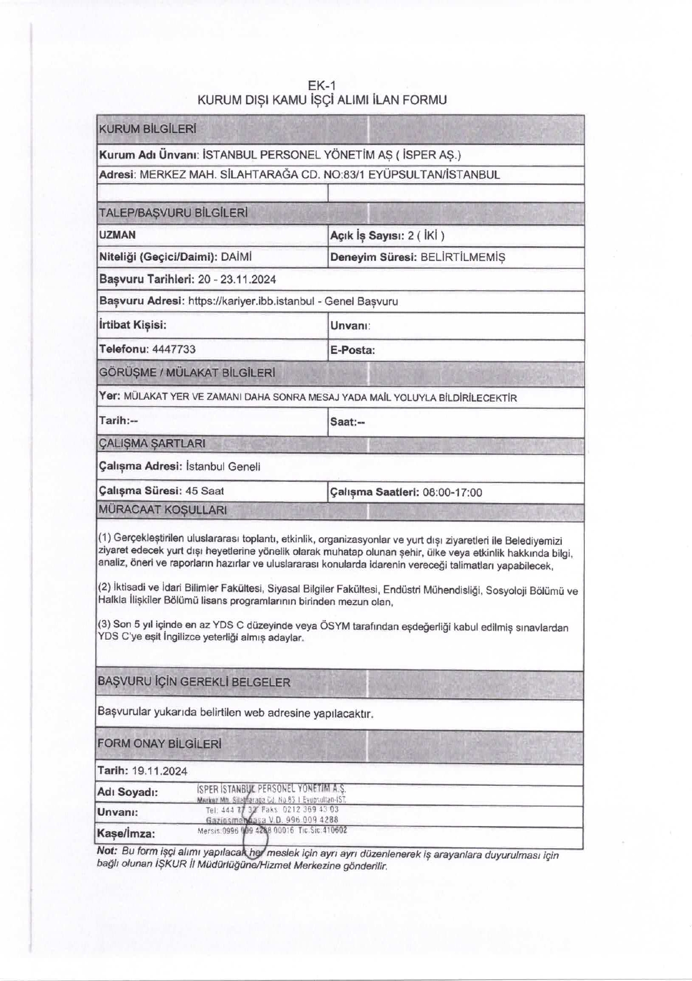 İstanbul Personel Yönetim Aş. 2 İşçi Alacak. Son başvuru tarihi 23 kasım 2024