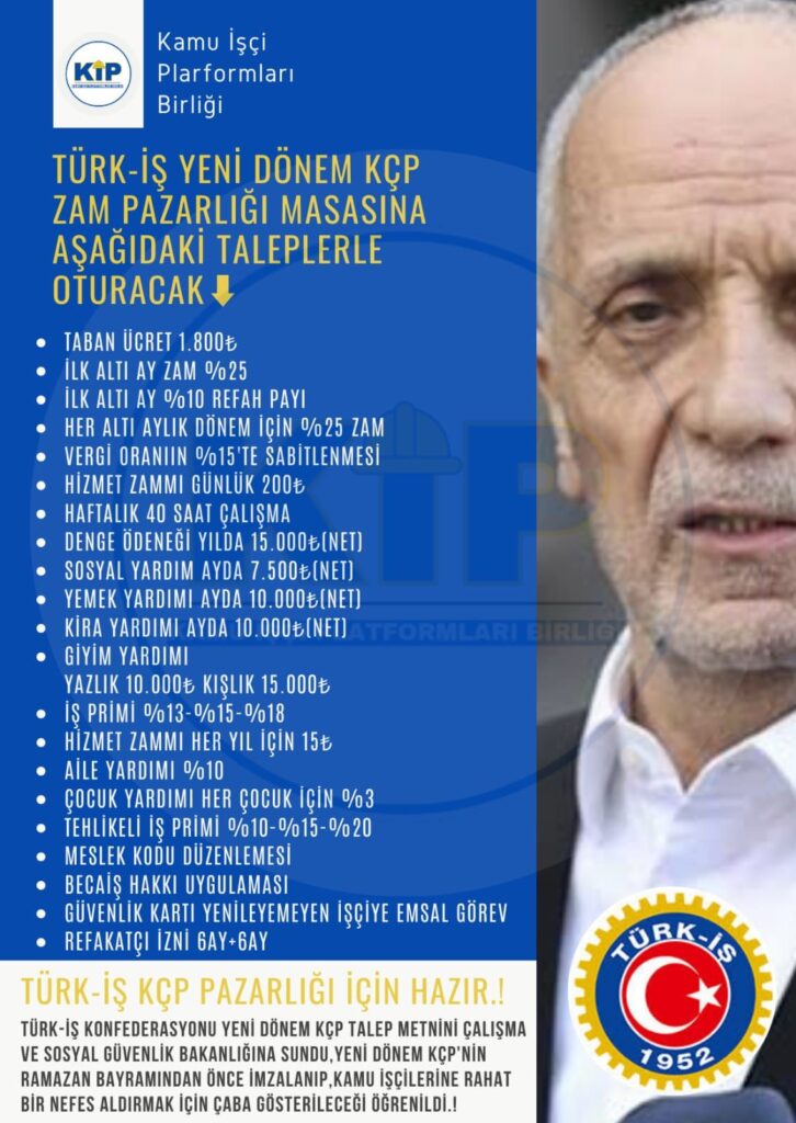 Kamuda çalışan işçilerin mali ve sosyal haklarını belirleyen Kamu Çerçeve Protokolü (KÇP) süreci devam ediyor. TÜRK-İŞ Konfederasyonu, kamu işçileri adına taleplerini içeren talep metnini Çalışma ve Sosyal Güvenlik Bakanlığı’na sundu. İşte öne çıkan talepler: