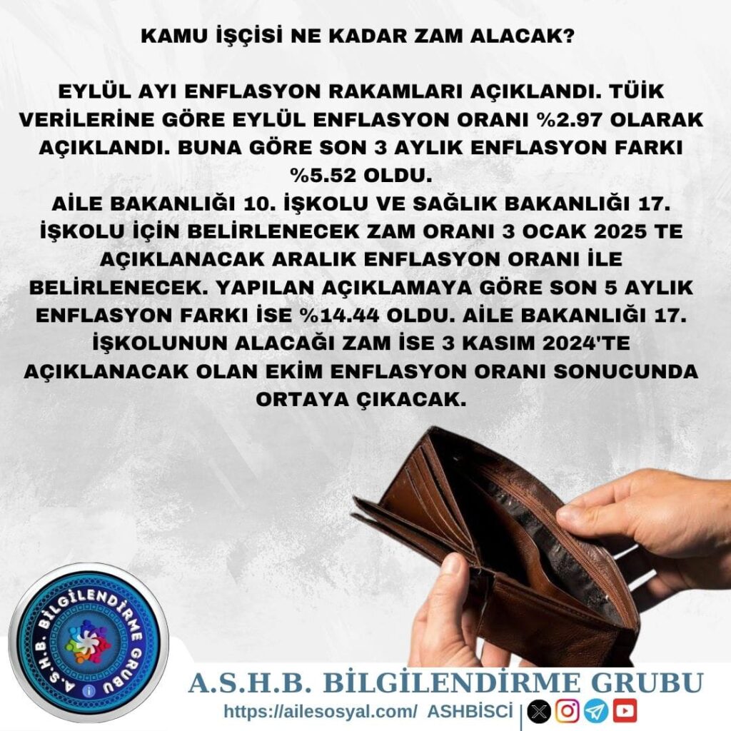 Aile bakanlığı 10. İşkolu ve sağlık bakanlığı 17. İşkolu için belirlenecek zam oranı 3 Ocak 2025 te açıklanacak Aralık enflasyon oranı ile belirlenecek. Yapılan açıklamaya göre son 5 aylık enflasyon farkı ise %14.44 oldu. Aile bakanlığı 17. İşkolunun alacağı zam ise 3 Kasım 2024’te açıklanacak olan Ekim enflasyon oranı sonucunda ortaya çıkacak.