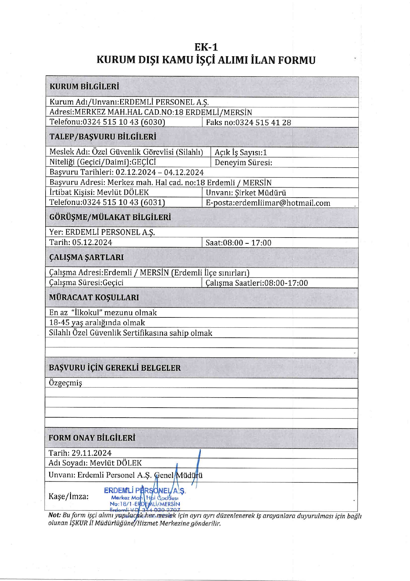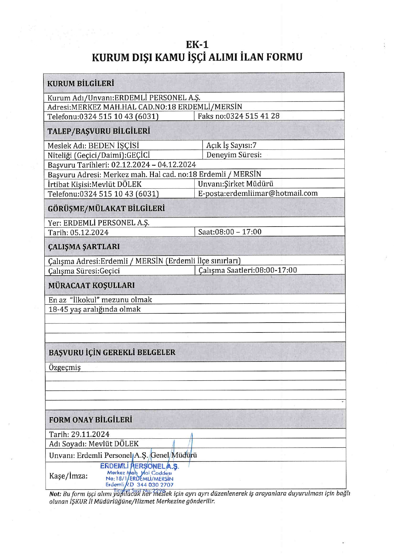 Mersin Erdemli Personel AŞ. Geçici 8 İşçi Alacak. Son başvuru tarihi 4 aralık 2024