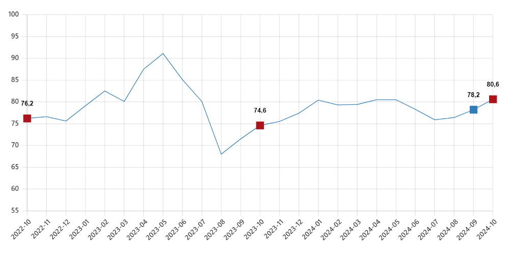 TÜİK ve Türkiye Cumhuriyet Merkez Bankası (TCMB) ile ortaklaşa yürütülen tüketici eğilim anketi sonuçlarından hesaplanan tüketici güven endeksi, ekimde yüzde 3,0 oranında artarak 80,6 oldu.