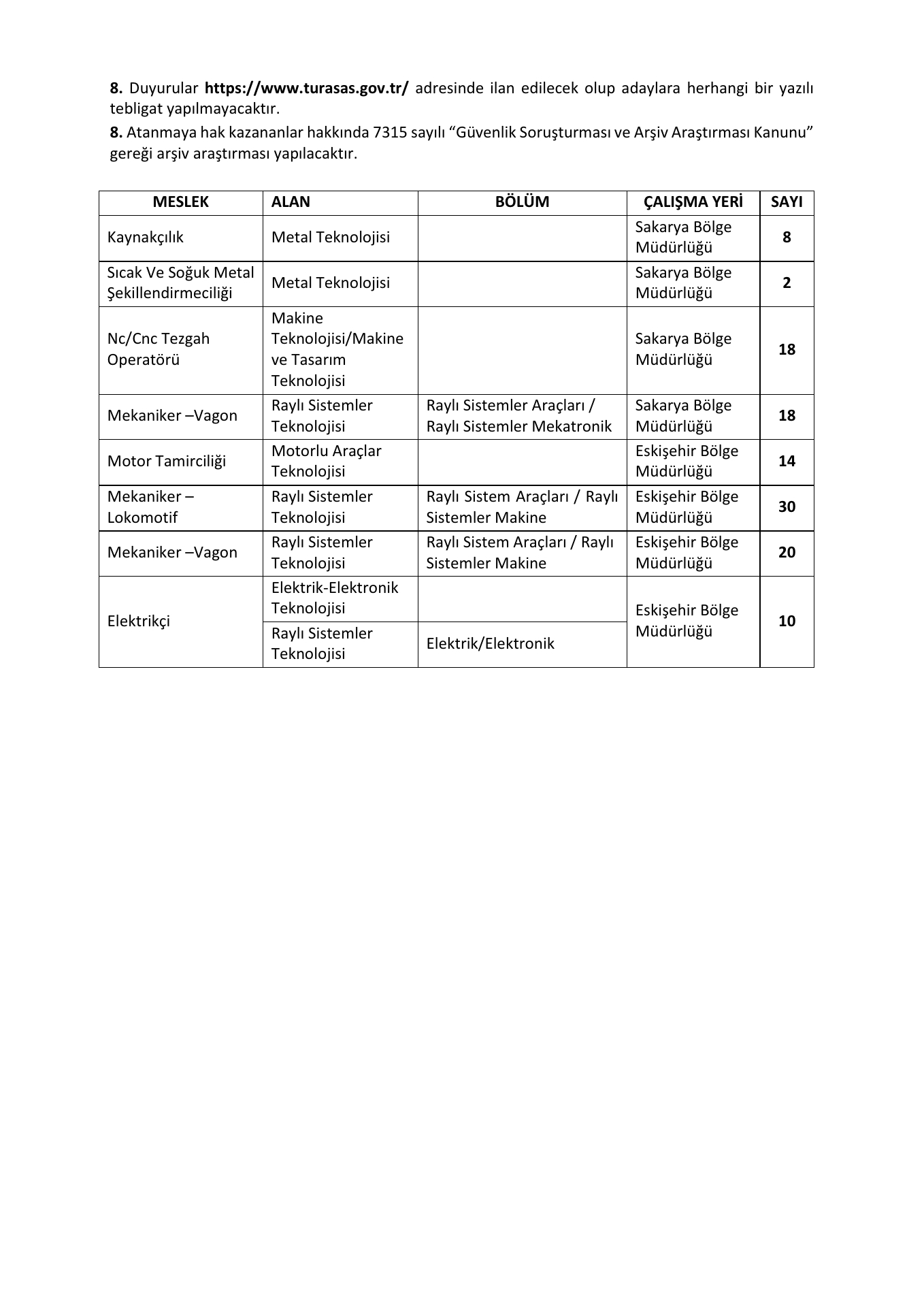 Genel Müdürlüğümüze bağlı Sakarya ve Eskişehir Bölge Müdürlüklerimizde istihdam edilmek üzere, Kamu Kurum ve Kuruluşlarına İşçi Alınmasında Uygulanacak Usul ve Esaslar Hakkında Yönetmelik hükümleri kapsamında Türkiye İş Kurumu (İŞKUR) üzerinden 4857 sayılı İş Kanununa tabi belirsiz süreli iş sözleşmesi ile çalıştırılmak üzere daimi işçi alımı yapılacaktır.